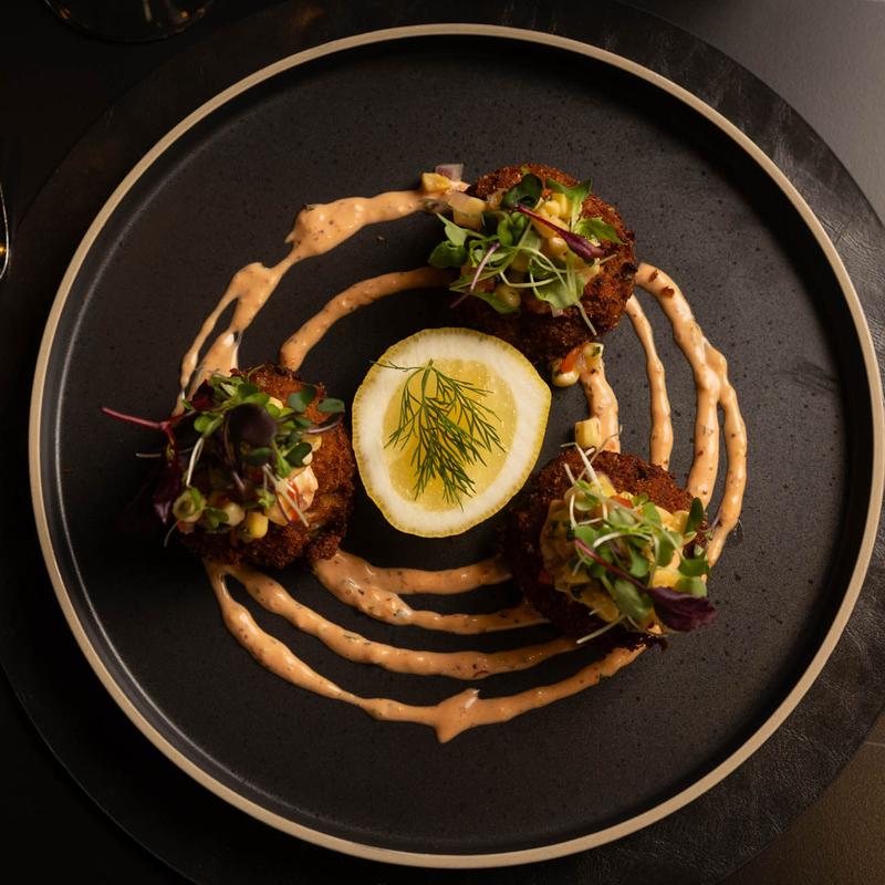 Sweet corn, bell pepper herb relish, fresh lemon, remoulade sauce.