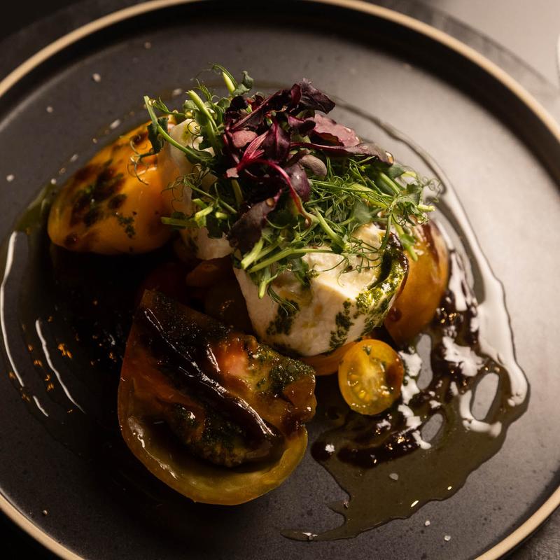 Variety of heirloom tomatoes, burrata, basil, pea sprouts, orange champagne gastrique, evoo | Celiac Soy Free