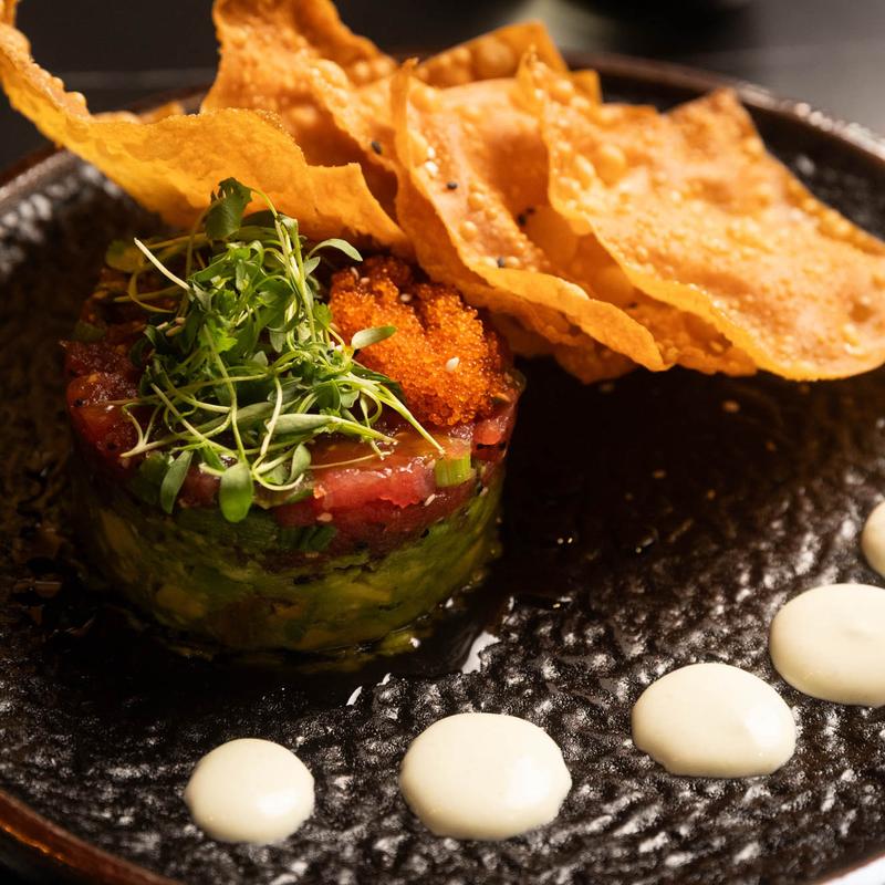 Diced tuna, scallions, sesame seeds, ponzu glaze, avocado, wasabi creme, cilantro, wonton crisps.