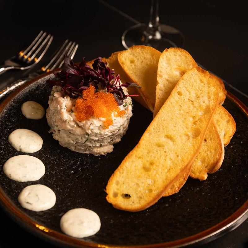Greenland shrimp, blue crab meat, red onion, dill horseradish créme, fresh lemon, Swedish caviar, toasted ciabatta** | Celiac Soy Free